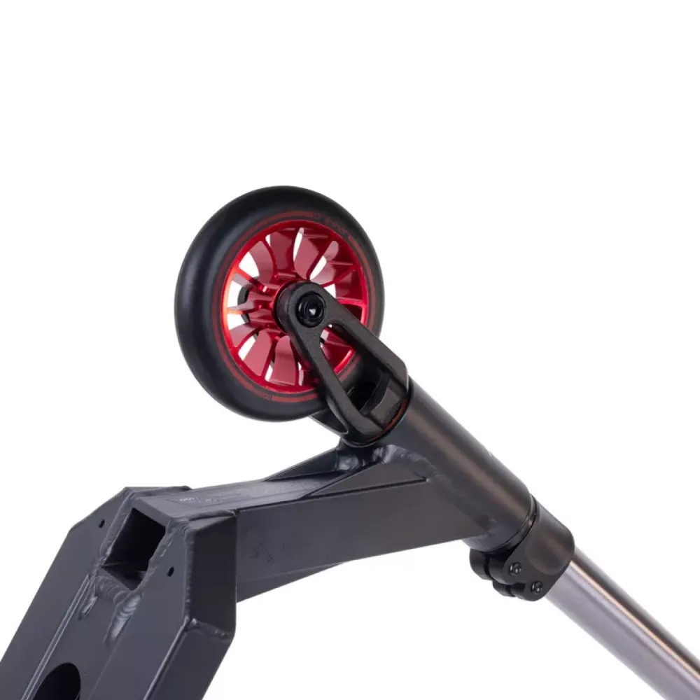Особое внимание уделено конструкции руля: он выполнен из высокопрочной стали, имеет внешний диаметр 34,9 мм, высоту 615 мм и ширину 540 мм, что гарантирует уверенное сцепление и удобство в эксплуатации. Вилка самоката изготовлена из алюминия и оснащена системой компрессии HIC, обеспечивающей эффективное гашение ударов при приземлении. Надежная дека, также выполненная из алюминия, обладает интегрированным типом рулевой, шириной 140 мм и длиной 490 мм, а футспейс в 340 мм позволяет правильно распределить нагрузку, что особенно важно для уверенного контроля при выполнении сложных элементов.